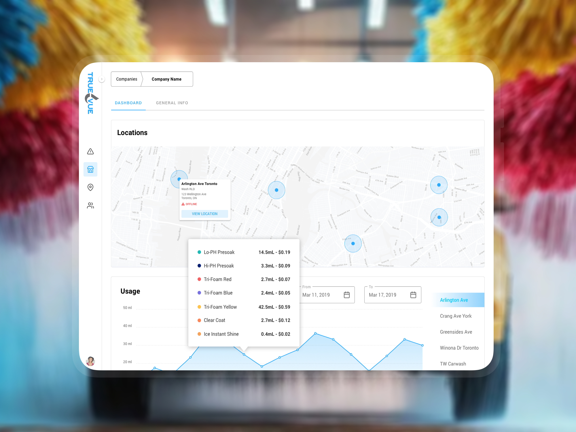TRUE-VUE chemical monitoring system uses high-quality analytics hardware and sonar sensors to deliver accurate and reliable readings. This allows you to quickly understand in real-time where every drop in each wash package was used.